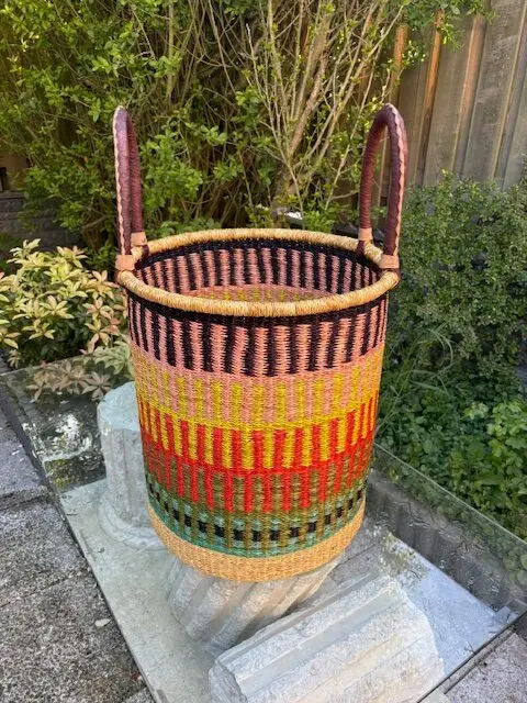 A large beautiful african handwoven laundry basket dominated with red and natural straw colours and with additional blue and green colours finished with brown leather handles.