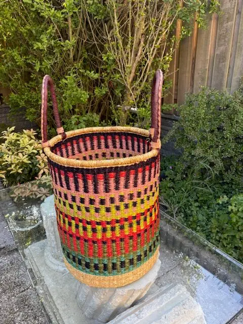 A medium beautiful african handwoven laundry basket dominated with red and natural straw colours and with additional blue and green colours finished with brown leather handles.