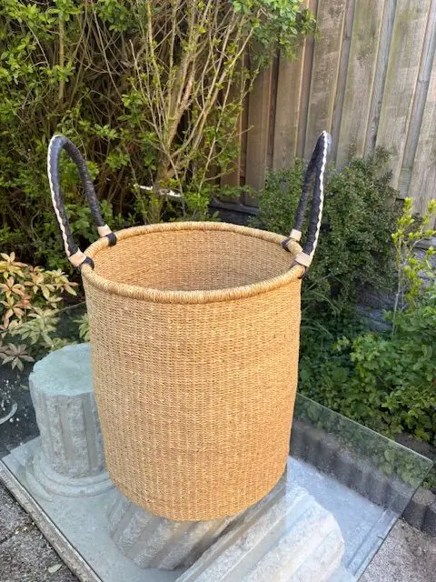 A large african handwoven natural straw colour laundry basket finished with black leather handles.