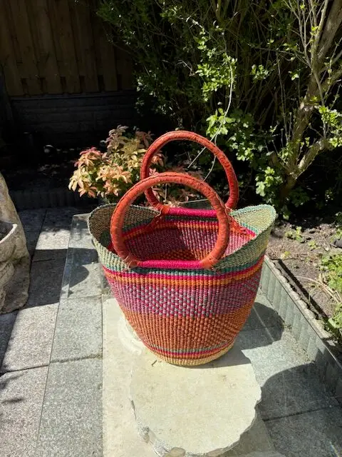 An african bright pink dominated u-shopper basket with other colour patterns finished with brown leather handles.