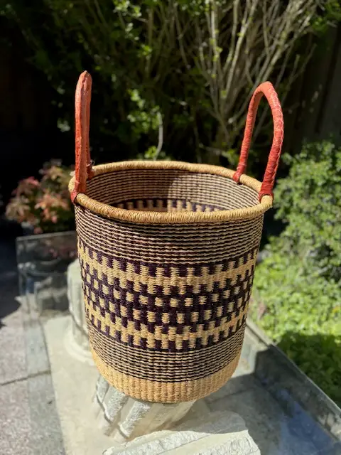 A beautiful african strong natural straw colour laundry baskets with blue patterns finished with black leather handles.
