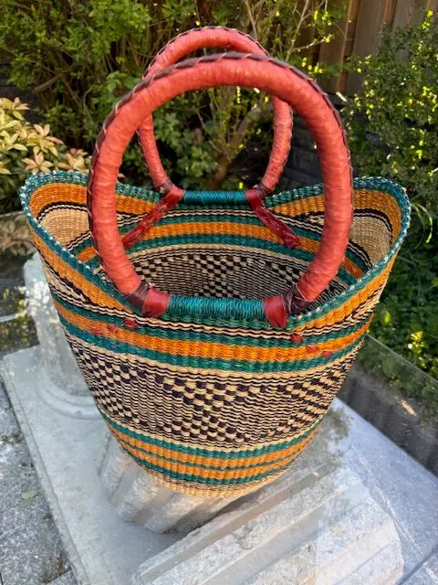 A colourful african dominated green and natural straw colour basket finished with brown leather handles