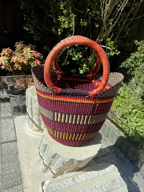 An african bright maroon dominated colour u-shopper basket added with other colour patterns and finished with brown leather handles