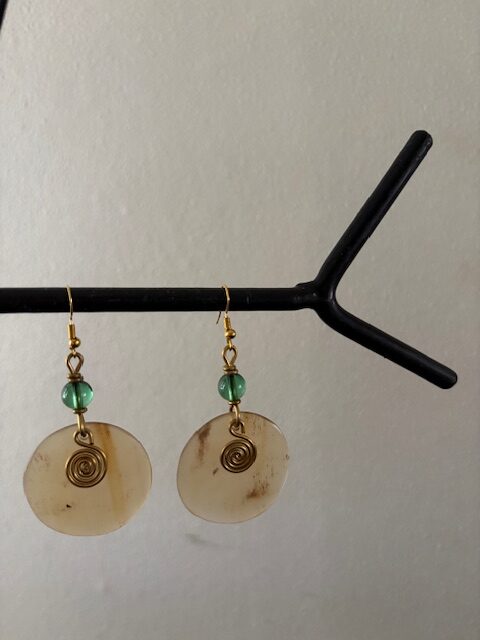 A pair of african handmade dangling transparent cowhorn round earrings finished with sap-green beads and brass artwork.